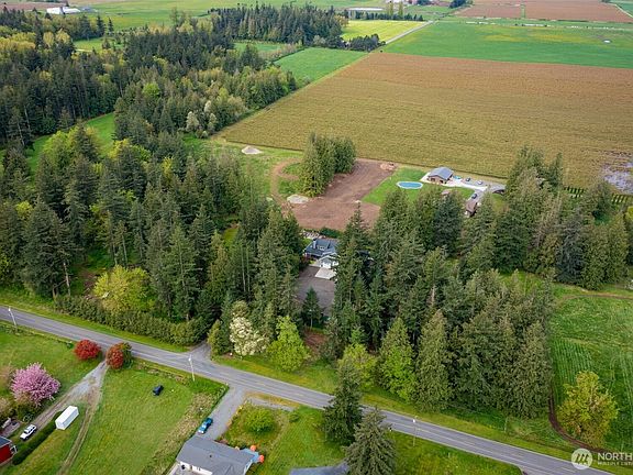 Incredible, parked-out 5 acre property & home that offers it all! Quiet & sunny area, with level & dry ground out of the flood plain with a truly stunning setting. The custom home is complete with 3-bay garage, including RV hookups + 220 power. Home includes generator + energy efficient & all-season comfort features inside, including A/C & wood fireplace. Fenced 2-acre pasture for equestrian or livestock. The landscaping is fully irrigated & includes garden beds + the dream setup for entertaining! Amazing gazebo with hot tub & bar. The south end of the property is wooded, with trails & includes utilities ready for a 2nd home DADU. Walk to Winery & Stoney Ridge Farm. Less than 10-minute drive to Lynden & under 20 minutes to Bellingham.