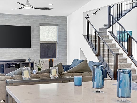 Nestled in the gated Terra Luna neighborhood of The Cliffs Village in Summerlin, the stunning two-story modern designed property features over 3,200 square feet of living space. The four-bedroom, four-bath home blends harmoniously with the natural surroundings. A courtyard entry leads into a spacious foyer. Porcelain wood tile flows throughout the main living space. Integrated gathering spaces such as an oversized loft or den offer versatility. The gourmet kitchen features a sizeable T-shaped island with quartz countertops, Espresso cabinets, striking backsplash, a walk-in pantry, and professional-grade appliances. An upper-level primary suite boasts an expansive walk-in closet and views of the surrounding landscape. Its luxurious bath features a soaking tub, a walk-in shower, and dual sinks. A covered porch and intimate firepit with seating create an exterior retreat. The property is in a coveted cul-de-sac that borders the natural surroundings.
