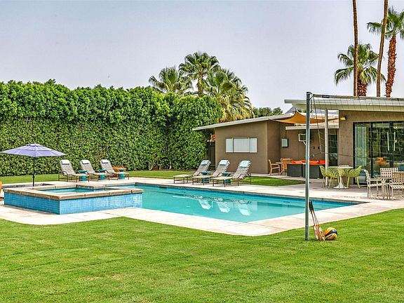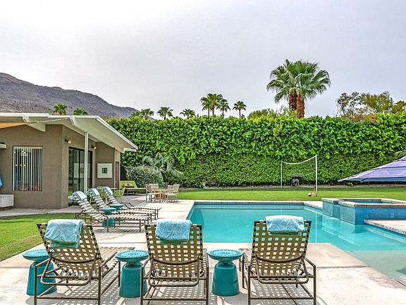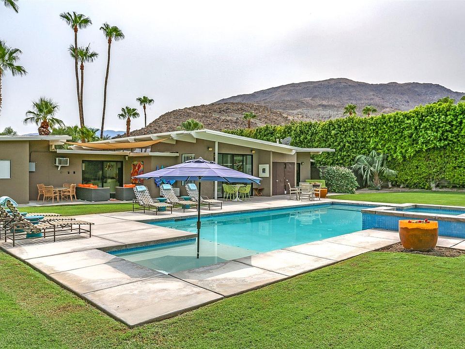 This enticing vacation rental has been thoughtfully re-imagined, evoking the glamor, style, fun and sophistication of the Rancho Mirage lifestyle. This exquisitely decorated and well-appointed vacation home offers resort style amenities on 16,988 square feet of land, providing you unparalleled privacy and breathtaking mountain views. The Happy Hour Hideaway is a stylish mid-century modern home with a prime location in the center of Rancho Mirage, only a short walk to the pleasures provided by the prestigious outdoor shopping and dining mall, The River in Rancho Mirage. The layout of this modern kitchen creates an intimate atmosphere to entertain friends and family, or prepare a quiet dinner. The recently renovated kitchen is fully stocked with new stainless steel appliances, a side-by-side fridge, gas stove, and quartz counter-tops, with a bar seating for 3. The dining area, just off the kitchen, has a beautiful setting with a glass table and plush comfortable chairs for a setting of 6. The open floor plan and walls of glass seamlessly connect the inside living areas to the backyard, pool and spa. This Rancho Mirage vacation home features a mix of authentic mid-century and modern furnishings, fun original art and beautiful lighting to create a sophisticated vacation rental experience the whole family will enjoy.