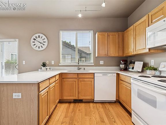 Welcome to this stunning 4-bedroom, 4-bathroom home located in The Cascades at Springs Ranch neighborhood, perfectly situated on a quiet street lined with mature trees in the desirable District 49 school district. This beautiful corner-lot residence is within walking distance to neighborhood schools and Remington Park, and offers easy access to shopping, dining, entertainment, and nearby military bases. Inside, you’re welcomed by solid wood floors that span the entire main level, soaring vaulted ceilings, and large windows that fill the home with natural light. The open-concept layout features a spacious living room with a charming gas fireplace and built-in storage, perfect for relaxing or entertaining. The kitchen impresses with new quartz countertops, new under-mount sink, a full suite of appliances, and pantry. The adjacent dining room opens to a private, fully fenced backyard with a large patio and lawn—an inviting space to enjoy Colorado outdoors. A convenient powder room and attached two-car garage complete the main floor. Upstairs, the expansive primary suite includes a private en-suite bath, while two additional bedrooms share a full bathroom. The finished basement provides a versatile suite with a bedroom area, a three-quarter bathroom, and laundry, plus a large crawl space for extra storage. With updated windows, central air conditioning, and a new furnace installed in 2022, this home is beautifully maintained and ready for you to move in and make it your own!
