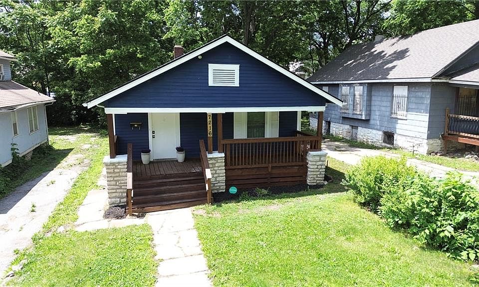 Check out this updated beautiful 2 bedroom / 1 bath home in Kansas City. Freshly painted exterior with a large front porch for entertaining and a new back deck for hosting fun summer gatherings and grilling out. This home is just a block away from Noble Park. The interior rooms were recently painted and have all hardwood floors. The kitchen features an open concept with exposed brick, butcher block countertops, marble herringbone tile backsplash, and white cabinets with a built in cutting board in one of the cabinets. Lots of countertop space and cabinet space for whipping up all your chef inspired dishes. There is a peninsula kitchen countertop with butcher block that can seat 2-3 bar stools. Just off the kitchen there is a new wood deck for adding space to entertain with a nice sized yard. The basement has freshly painted walls and floors with lots of new lighting making it a bright space.