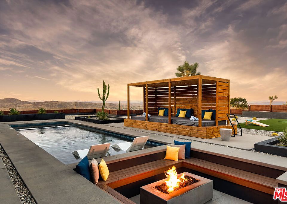 Desert Villa Newly Built with Resort-Style AmenitiesCompleted in 2023, Desert Villa is a proven high-performing short-term rental, generating approximately $305,000 annually. Set on a full acre dotted with iconic Joshua Trees, this modern retreat offers a private resort experience just minutes from Joshua Tree National Park, dining, and shops. Inside, the open-concept floor plan features over-height ceilings throughout, a chef's kitchen with premium appliances, spacious living and dining areas, and four bedrooms: a primary suite, two junior suites, and a guest bedroom. Modern comforts include central A/C, Nest climate control, a Sonos sound system, an EV charger (Type 2), and parking for up to six vehicles. The 495 SF two-car garage has been converted into a stylish indoor recreation area complete with lounge seating and games for year-round entertainment. Designed for both relaxation and recreation, the property is elevated above the lower valley, offering sweeping views of the basin and Joshua Tree National Park. Amenities include a brand-new pickleball court, swimming pool and spa, a sunken conversational fire pit, bocce ball court, mini golf course, and a tranquil yoga deck. Additional highlights include a large cabana, an outdoor dining area with barbecue, a cantilevered shaded barbecue station, and expansive lounging areas throughout the grounds, all within close proximity to the park entrance. The sleek architecture blends seamlessly with the desert landscape, offering privacy and serenity in an upscale neighborhood. Whether as a luxury retreat, full-time residence, or income-producing investment, Desert Villa is designed for unforgettable experiences year-round.