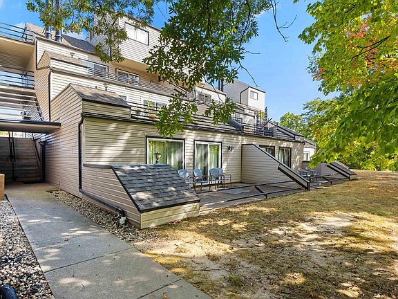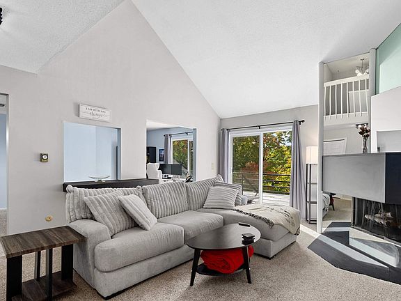 PRICE IMPROVEMENT! Step inside this inviting condo where natural light, soaring ceilings, and serene wooded lake views create the perfect place to call home. Two sets of oversized sliders frame the views and open to an extended deck — the ideal spot to relax, sip coffee, or entertain friends. The great room is anchored by a cozy wood-burning fireplace and open catwalk above, giving the space a bright and airy feel. Just off the dining area, you’ll love the built-in cabinetry for extra storage and style. The kitchen features crisp white cabinets, a breakfast bar, and all appliances included, ready for your next meal or gathering. A nearby den with wet bar adds even more versatility — and could easily be converted into a third bedroom. Upstairs, a charming loft nook offers a quiet retreat for reading or working. The primary suite feels spacious with vaulted ceilings and a large closet. The second bedroom is generous in size with a walk-in closet currently converted to a convenient laundry space. A large shared bath completes the upstairs. With a two-car garage, storage unit, and some of the best wooded lake views around, opportunities like this don’t come often — schedule your showing today before it’s gone!