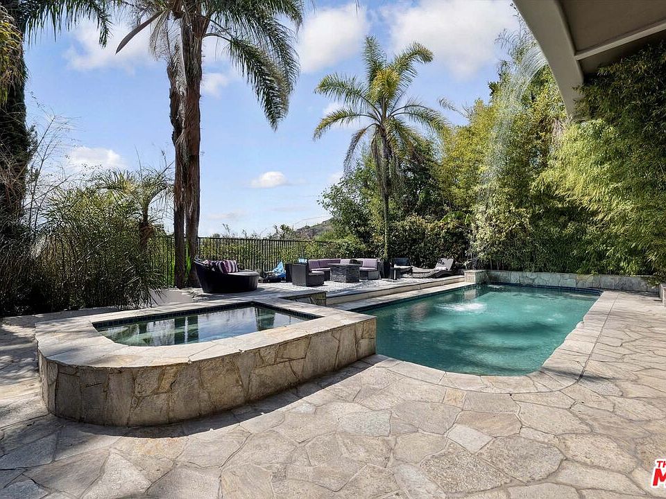 Exceptional offering! Ultra-private Hollywood Hills compound on Mulholland, approx. 7,000 sq ft with skyline views, gated motor court, 6 en suite bedrooms, and 10 baths. Features include a sunken living room, formal dining, chef's kitchen, media room with bar, a second kitchen, wine room, and elevator across three levels. Resort amenities: saltwater pool/spa with waterfall, outdoor kitchen/bar, gym, sauna, and steam. The sixth en suite has its own private entrance and is a complete apartment with a living room, media area, and full kitchen ideal for large families, in-laws, rental income, investors, and 1031 exchange buyers. Bulk sale option available with 8827 & 8835 Evanview Dr.