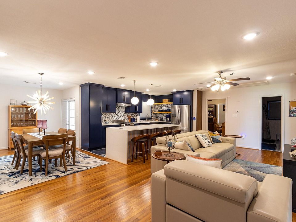 Mid-century modern in style, but major renovations completed by January, 2025, with all new mechanicals (HVAC, PEX Plumbing & Electrical). Beautiful brick exterior was reworked in the German Schmear style. The interior has an open concept of living, dining & kitchen combined. Custom kitchen cabinets with soft close feature & custom hardware. Kitchen appliances are stainless steel Frigidaire. Gas range has an air fryer oven. Kitchen island has a Sharp microwave drawer & pop-up electrical outlets. Stainless steel Farm sink from Zuhne. Primary bedroom has large ensuite bath. One of the other three bedrooms has French Doors opening to living room & currently has a grand piano. GE Profile Heavy duty/large capacity stackable washer/dryer with 10 warranty. The garage is over-sized 2 car with garage floor having a Polyurea/polyspartic coating & two custom floor drains. Recent roof with CertainTeen Landmark hand nailed shingles with 30+ year life w/attic having R30(12")blown-in insulation.