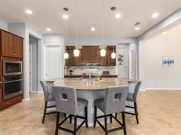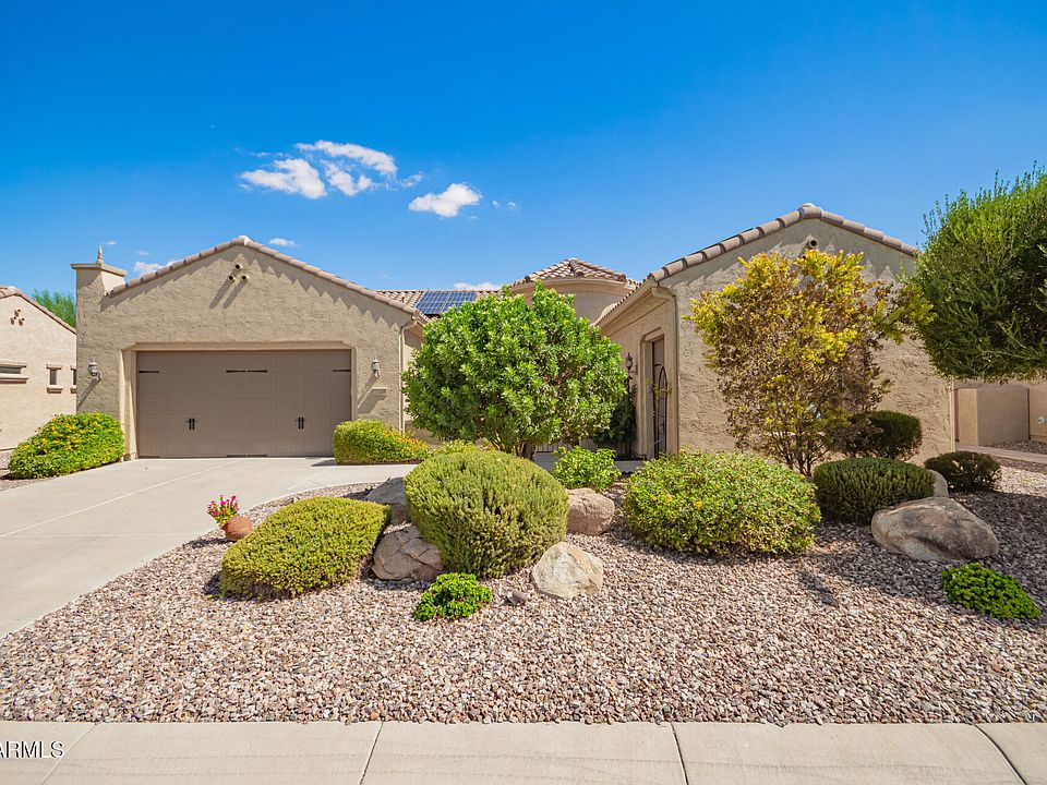 Welcome to your dream home, where lush landscaping greets you in the beautiful paver courtyard. Perfect for entertaining, the extended paver patio in the backyard features surround sound & mature vegetation for added privacy, beauty... enjoy peaceful, relaxing evenings around the gas fire pit. The kitchen features rich walnut cabinetry, granite counters, gas cooktop, pendant lighting & dbl pull-out shelves for added convenience. Plantation shutters & new carpet in all 3 bedrooms add warmth & comfort, while remote-controlled blinds & surround sound bring modern luxury to your living space. The 2 car garage features an extended side, built-in cabinets, 8' garage doors & CART GARAGE! ++NEW A/C-23, TOF BOND PAID in Full, OWNED SOLAR for energy savings! Sun City Anthem at Merrill Ranch offers a 48,000 SF recreation center w/ craft rooms for quilting, pottery, glass works, jewelry & crafts, spacious ballroom w/ stage for dancing, theatrical productions, concerts & more. PLUS full gym, work out rooms, indoor lap pool & spa, walking track, cafe area, card rooms, poker tables, pool table, ping pong table, business center, class room for interesting seminars! Troon Poston Butte Golf Course is one of the nicest in the area. Sun City offers Pickleball, Tennis, Bocce Ball, Horseshoes, Shuffleboard, clubs for all activities.......LIVE WHERE THE SURROUNDINGS DELIGHT, INSPIRE & CHALLENGE YOU!