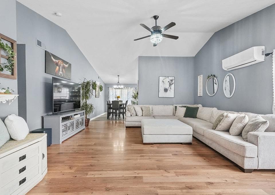 Welcome to 722 8th Street, Ramona, CA 92065! This beautifully maintained single-story home combines comfort, style, and convenience in the heart of Ramona. The bright and open living area features cathedral ceilings, creating a spacious and airy atmosphere. The functional kitchen flows seamlessly into the living space, perfect for entertaining or family gatherings. Enjoy central air for year-round comfort, a 2-car garage, and a convenient laundry area in the garage. The master bedroom includes a walk-in closet, ample storage and organization. Step outside to a large yard, perfect for outdoor activities, gardening, or enjoying the California sunshine. Located just minutes from Main Street, local shops, dining, and schools, this home delivers the perfect balance of small-town charm with modern amenities.