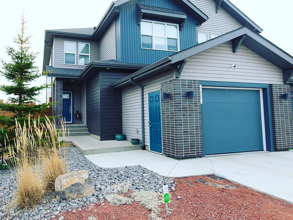 One of the biggest Dolce vita's show home duplex, beautifully painted with pastel colors & wrapped in wall papers, centrally air-conditioned, built on 8500+ sqft pie-shaped lot. Heated tandem garage (painted, 14 feet ceiling with chandeliers, side door) to walk through big pantry to spacious kitchen with 2 toned & tinted glass cabinetry & quartz countertop. Main floor & basement having 9 feet ceiling, electric fireplace, ample storage, large size windows in living area with great view of the creek & natural day light. 3 bed rooms, 2.5 bathrooms (5 piece ensuite bathroom & double vanity), bonus room & laundry on upper floor. Decorated with 10k worth of customized window coverings & curtains, high end finishing, wall papers and quartz countertops with lots of storage space. Creek facing, landscaped, fenced backyard surrounded by fruit trees with finished deck, fire pit, 15 feet wide side entrance with custom door. Alum/stone outdoor finish having concrete entrance make this dwelling one of kind properties.