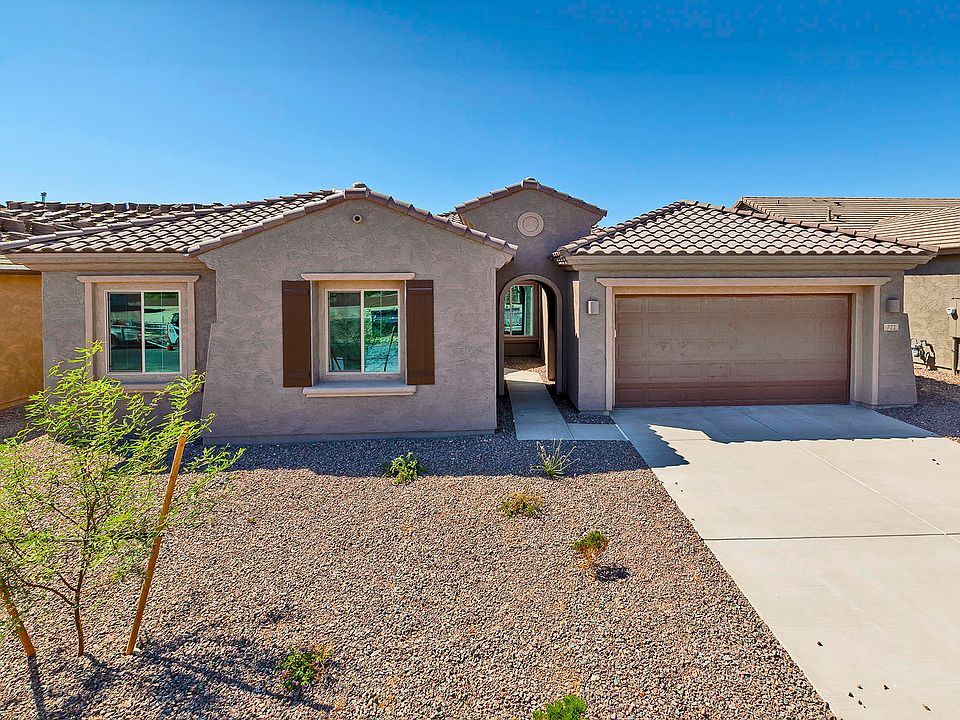 All single-story neighborhood in Rancho Vistoso featuring this brand-new designer with an approximate August move-in date. Desirable split plan featuring elevation A, with a 2' rear of home extension; av built in + den. Offers large covered patio for entertaining and a 2' garage extension. Amenities inside include a gourmet kitchen with gas stainless steel appliances including a French door fridge and upgraded lux cabinet layout. Owner's bath has a low threshold glass walk in shower. Flooring is upgraded. Quality energy efficient features include Lennox A/C and Rinnai tankless water heater.