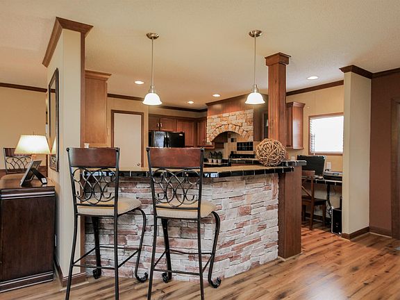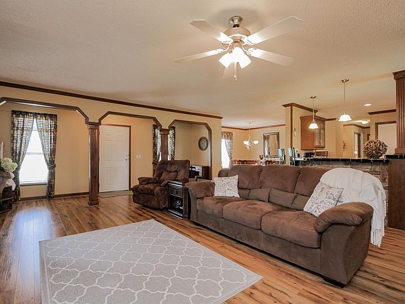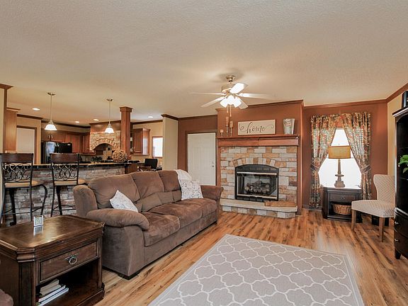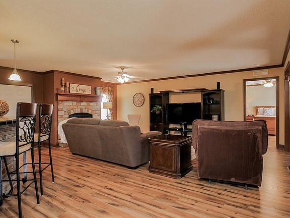 Beautiful home Country Setting with great views Five acres partially fenced Detached garage storm shelter Covered front porch and patio in back three bedrooms with two full baths open kitchen with a bar and living room with fireplace and dining room