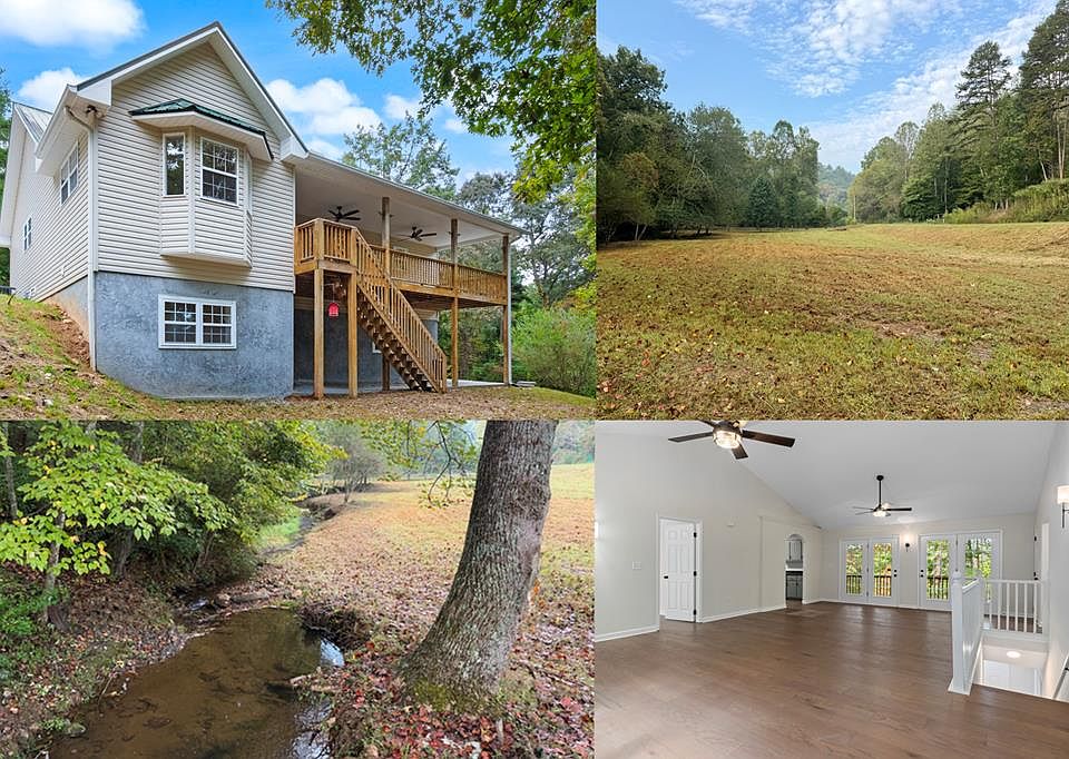 Tucked away on over two wooded acres in sought-after Brasstown, NC, this completely remodeled 3-bed, 3-bath home with TWO bonus rooms delivers the rare combination of privacy, convenience, and modern upgrades you've been searching for! Enjoy NO HOA while fronting a quiet paved state road. Turn into your drive to admire your rolling pasture with Greasy Creek flowing through (you own both sides!) before winding up to the home's secluded setting. There's abundant parking and a TWO-CAR GARAGE. Step inside to a light-filled Great Room with vaulted ceiling, brand-new flooring, and a cozy gas-log fireplace framed in rustic reclaimed barnwood, plus double doors opening to the back porch for effortless indoor-outdoor living. A HUGE laundry room offers a utility sink and extra hookups for freezers or ice makers. The kitchen sparkles with granite counters and brand-new stainless appliances. The split-bedroom plan provides privacy to the MAIN LEVEL Master Suite with its own romantic gas-log fireplace, private balcony, and freshly updated bath. On the other side of the main level, the guest bedroom, full bath, and bonus room complete the main floor. The lower level adds a third bedroom, bonus room, full bath, second laundry hookup, garage access, and a walkout patio—perfect for an in-law suite or rental. Recent upgrades include a 2024 dual-fuel heat pump, 2025 septic inspection/pump, and a top-to-bottom 2025 remodel. Need more space? An additional 2.23 acres with more pasture and creek frontage is available. This move-in ready retreat offers unmatched beauty, versatility, and peace—homes in Brasstown sell fast, so schedule your showing to see your future home before it's gone!