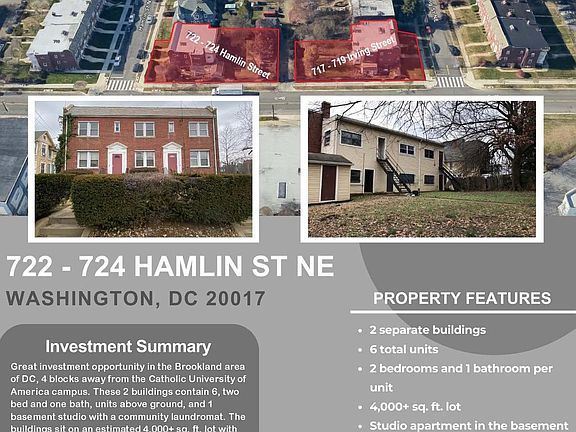 LOCATION, LOCATION, LOCATION ! TOPA FREE-Ready for a Condominium Conversion or Long -Term rental investments in the Nation's Capital, Washington D.C. These 2 multi-family apartment buildings are being sold as a package with a total of #6 Two Bedrooms and One Bathroom Units and a separate apartment in the basement. The combined total of seven units in two different buildings They are a set of duplexes with the addresses of 724 Hamlin ST and 722 Hamlin St NE Washington D.C. located on the Brookland Subdivision within walking distance to The Catholic University of America Campus. the buildings are fully vacant and TOPA FREE., There are two identical sister buildings are situated back-to-back corner lots with an alley in between facing each other, 719 Irving NE Washington D.C and 717 Irving Street NE Washington D.C. 20017, The prices breakdown are as follows: the set of two buildings with seven units are priced $1,490,000.00. The same goes for the sister building located at 719-717 Irving St. The listing MLS ID# DCDC2155456 The buildings have been owned and managed by one family for over 30 years (TOPA FREE). The buildings are well maintained and reflect the 1990 style. Located near 2 metro stations, the Catholic University of America, and some of DC's best dining and breweries in the Monroe Market shopping center.