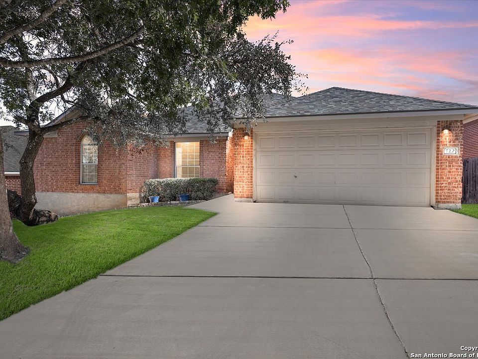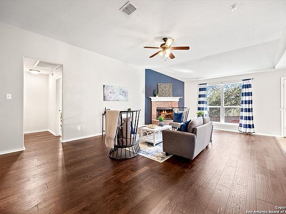 Move-In Ready One-Story Backing to a Greenbelt! Tucked away on a quiet cul-de-sac, this beautifully maintained one-story home offers privacy and comfort with no rear neighbors. The home backs up to a greenbelt and features a private gate providing access to the HOA amenities, including trails that lead to the dog park, pool, and walking paths. Recent updates provide peace of mind, including a roof and HVAC replaced in 2021, a water heater in 2024, and a water softener in 2025. Step inside to find an open floor plan with newly installed wood floors in the main living areas and a cozy wood-burning fireplace as the focal point. The kitchen features freshly painted white cabinetry, a new brushed nickel faucet, and a dishwasher installed in 2022. The flexible layout includes a 4th bedroom that can easily serve as a home office, accessible from both French doors off the hallway and a standard bedroom door near a full bath. The spacious primary suite offers a peaceful retreat with dual vanities, a separate tub, and a walk-in shower. Enjoy the perfect combination of privacy and convenience-close to JBSA-Lackland, SeaWorld, shopping, and major highways (1604, 151, and 90).