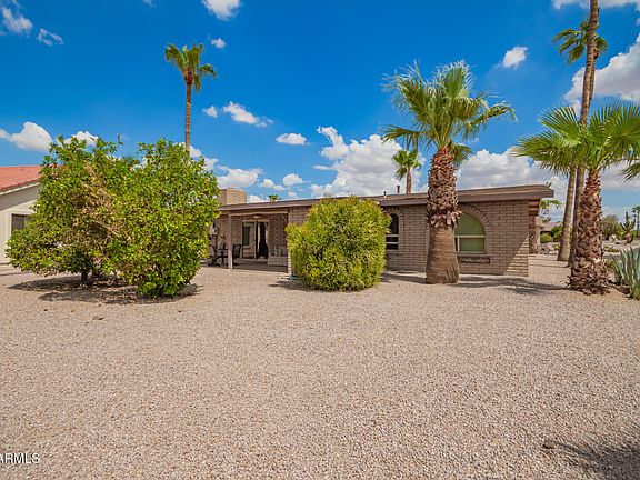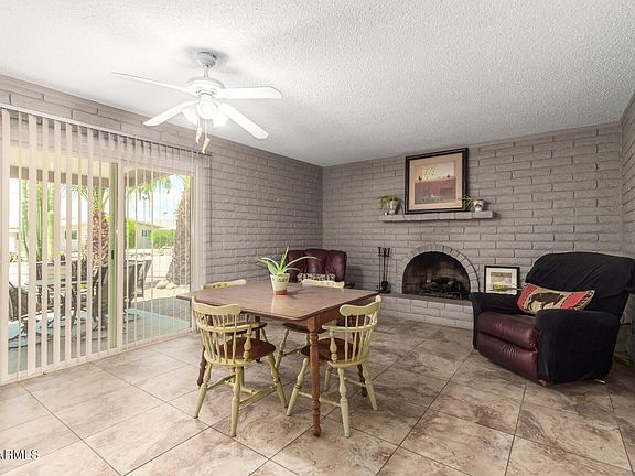 New Price! Welcome to the vibrant adult Community of Fountain of the Sun! This coveted corner lot home welcomes you with a low-maintenance landscape with beautiful date trees and an inviting front patio. Discover a serene living room with a soothing palette, blinds, and soft carpeting underfoot. The family room includes a cozy fireplace for relaxing evenings. Culinary adventures await in the kitchen, equipped with crisp white cabinetry, stainless steel appliances, a pantry, and a peninsula with a breakfast bar for casual meals. The main bedroom includes a private bathroom and a walk-in closet. The second bedroom has soft carpeting for added comfort. Imagine tranquil afternoons in the backyard, complete with a covered patio and citrus trees. Make this gem yours!
