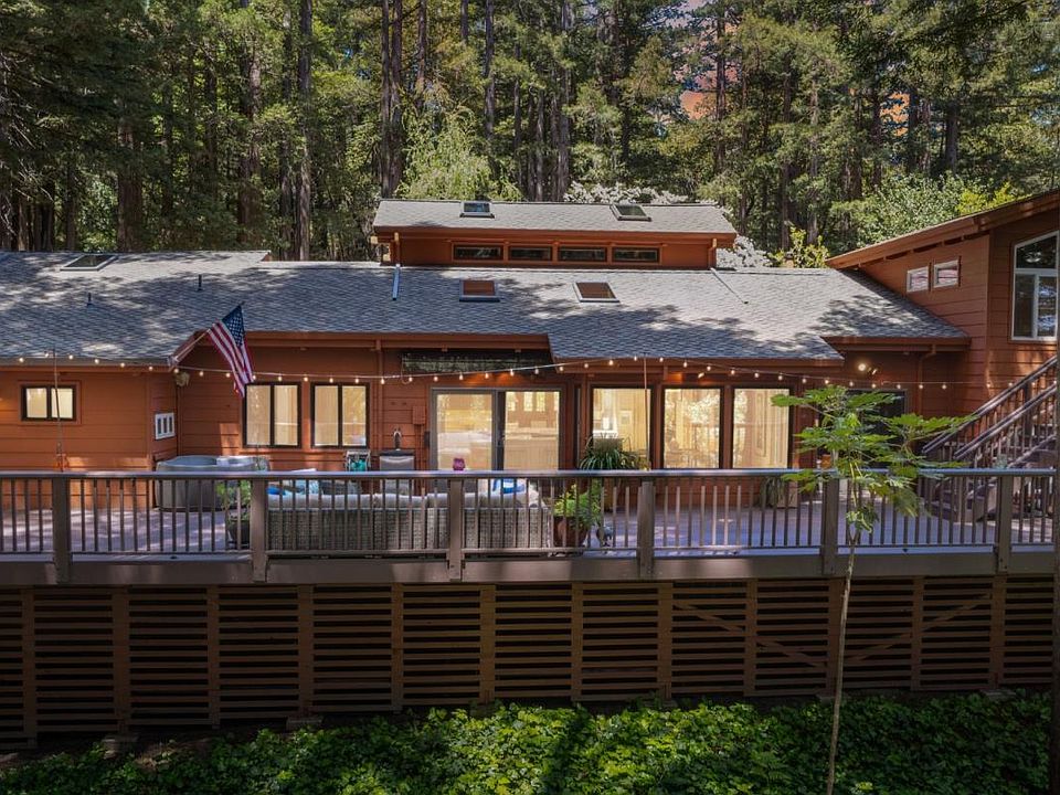 Embrace the exceptional year-round climate as you unwind on the expansive treehouse-like 1200 sqft deck, enjoying the muted hush of the redwood canopy. This exceptional estate boasts a distinctive layout, featuring a wing w/ suites & ample closets, & a jacuzzi spa tub & shower, all accessible via the deck. This property is ideal for guests or multi-generational living. Culinary enthusiasts will revel in the gourmet kitchen, equipped w/ pull-out shelves, dual pantries, & soft-close drawers. Retreat to the primary suite, where abundant natural light pours through large windows & skylights, complemented by a recently renovated ensuite w/ heated floors & a spa-like bathroom experience. The suite is complete w/ a spacious closet adorned w/ custom built-ins. A bonus permitted 1000 sqft workshop is perfect for woodworkers, yogis, or as an artist studio.