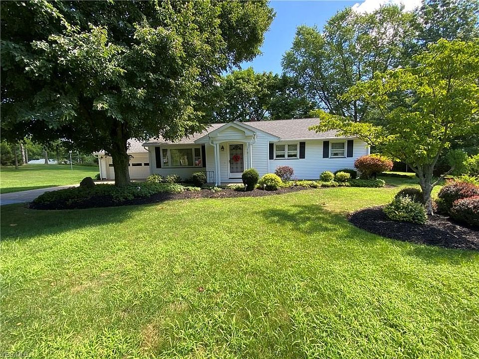 Wonderfully cared for 3 bedroom 1.5 bath ranch featuring a fantastic eat-in kitchen with wood floors,, a generous supply of cabinetry and countertops plus a center island, complete appliance package and vaulted ceilings! There is a first floor full bath with walk-in shower, stackable laundry and extra long vanity and mirror. Wood floors under the carpet in the spacious living room that also boasts a fireplace. Partially finished basement (w/second fireplace) newer furnace and AC, fenced rear yard, storage shed, patio, deck and paved drive all set on a beautiful double lot.