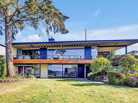 This Mid-Century Modern home was originally designed in 1950 by John T. Ridley (yes, the architect behind the Space Needle!) Expansive windows allow for outstanding lake, mountain & city views. The angles of the home and carport are beyond cool. Open floor plan features updated kitchen w/ solid wood cabinets, quartzite counters, engineered hickory wood floors & windows galore. The decks are exotic hardwood. The covered front deck includes a gas fire pit & hot tub & the covered back deck is plumbed for gas grill. System upgrades include replaced sewer line, newer furnace, pex plumbing & updated electrical panel. Laundry/exercise rm w/ sauna. Fenced back yard with treehouse. Quiet & friendly neighborhood close to shops, parks and restaurants.