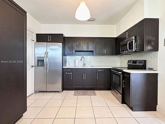 Charming 3-bedroom, 2-bath single-family home featuring a spacious layout with tiled flooring throughout. The kitchen offers stainless steel appliances, dark wood cabinetry, and plenty of counter space. Enjoy a dedicated laundry room with ample storage cabinets for added convenience. The home is equipped with a security camera system for peace of mind. Outdoor living is a breeze with a covered terrace, large patio, and storage shedperfect for entertaining or relaxing.