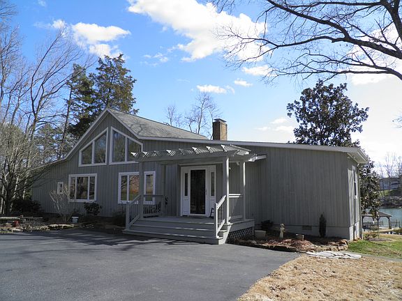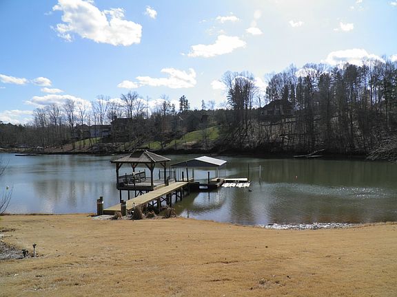 Beautiful 240+ feet of waterfront in quiet cove. Large, .98 of an acre lot and updated home. Private pier/dock with boat slip, 2 PWC slips & a covered sitting deck over the lake. Renovated kitchen w/granite tops, gas stove & center island. Great open plan w/vaulted ceilings, lots of natural light & lake views. Master on main level and an additional sunroom or office. 2 fireplaces with gas logs. One in great room and one in rec room. *Small floor portion of original mobile still within home.*
