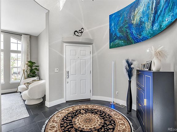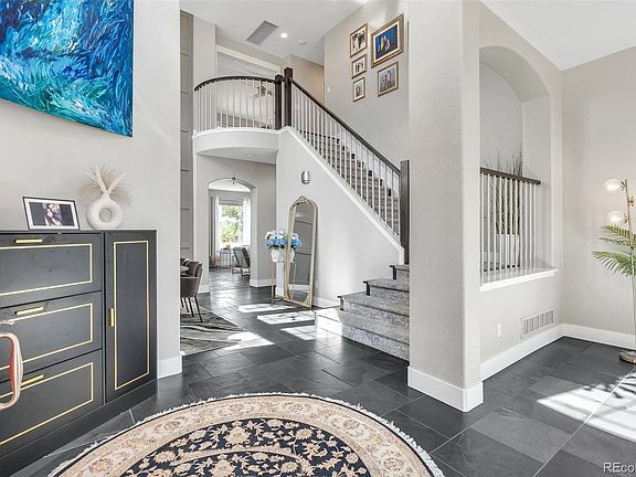 Welcome home to this beautiful move-in ready home backing to dedicated open space! Upon driving up, the curb appeal and updates will beckon you to go inside. Entering into this foyer, you'll immediately notice the abundance of natural light and the slate floors throughout with the dramatic rotunda. The living room to your right looks out to the front yard and is a versatile space that could be used as an office. Continuing in, the dining room with the soaring 2 story ceilings, custom wall treatment & one of a kind chandelier along with a wall of windows is a wonderful space for year-round gatherings. Entering into the heart of the home, you'll be greeted by the adjoining refreshed kitchen and family room. The large center island w/quartz counter is perfect to hang out plus you can wash dishes with a view to the open space! The kitchen nook is ideal for informal dining and gathering. You will love the oversized family room is large enough to accommodate the family while you enjoy the marble tile surround fireplace. Upstairs, walking through the double door entry into the primary suite, the vaulted ceilings, views to the open space and adjoining five-piece bathroom are paired w/engineered hardwood floors and tile in the bath. Primary bath is complete with dual vanities, large soaking tub, sep. shower and a custom walk-in closet. There are 3 additional bedrooms upstairs along with another full bath. The 2nd floor laundry room is complete w/cabinets & utility sink. In the basement you'll encounter unfinished space for your future living space & lined crawl space for more storage. Outside, you will love the lg flagstone patio with a seating wall, gas fire pit, lounging and dining areas, along with direct access to the open space, allowing you to easily access the trail system throughout the Castle Pines community. The neighborhood includes pool, clubhouse, park, pickleball courts, & more! Don't wait, see this home today!
