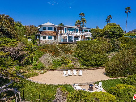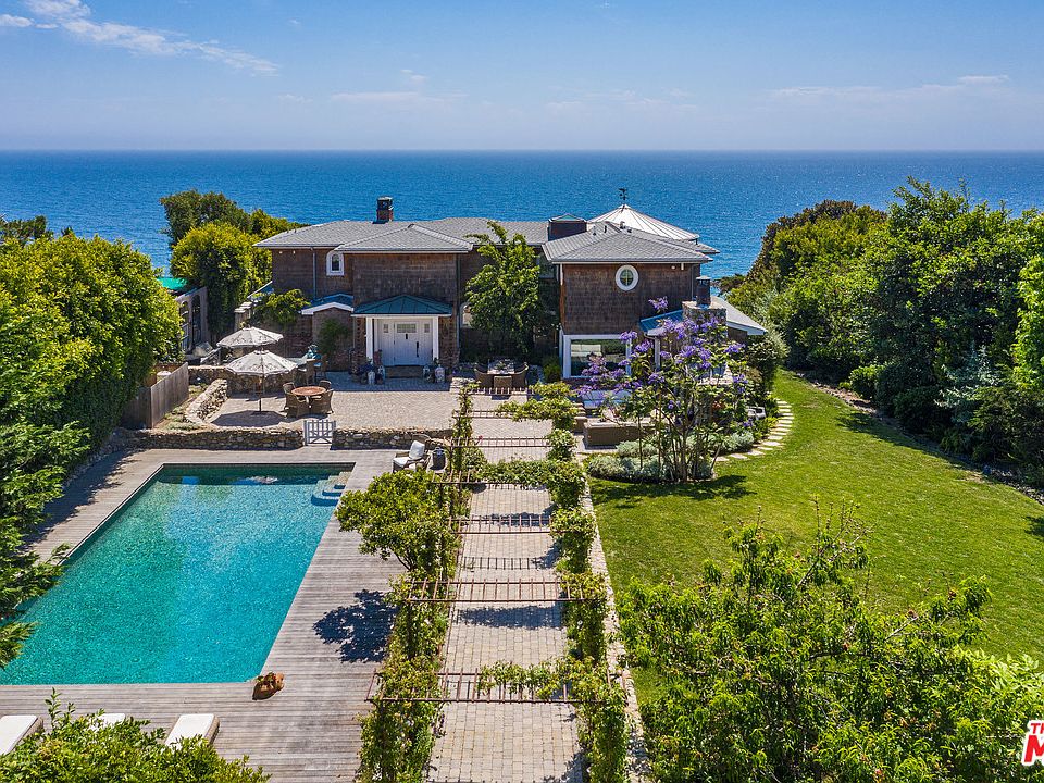 Situated on the Point Dume bluff, this ultra-private, Cape Cod-inspired estate designed by Doug Burdge, AIA offers spectacular ocean views and direct, gated beach access. The main house and guest cottage are surrounded by fruit trees and large grassy lawn. Flower-laden trellises frame the entry walkway to the pebble-tiled pool and entertainer's patio, with a river rock stone fireplace and outdoor kitchen. Elegant interiors feature walnut floors, Carrera marble counters, casual and formal dining and glass pocket doors to the ocean-facing terrace. The 2nd-floor master suite boasts an ocean-view terrace, walk-in dressing room, and soaking tub. Steps from the main house lead down the hillside to the home's private sandy beach and the oceanfront below. Home features include surround sound, security system and a 3-car garage. From its commanding perch on Point Dume, the estate offers the utmost privacy and serenity in one of the most sought-after locations on the Southern California coast.