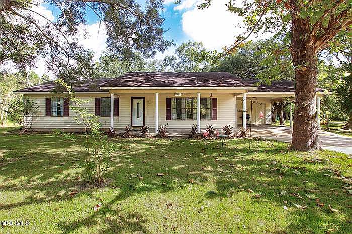 Charming 3bed/2bath home on a large lot with beautiful shade trees, planted fruit trees, and flowering shrubs! This very well maintained home of 1443sf is move-in ready and features a covered front porch, carport with storage room, crown molding throughout, spacious kitchen with large pantry, large laundry room, BRAND NEW 2 month old HVAC, and vinyl siding for easy maintenance. Everyone who comes to this home just falls in love because of it's simple yet oh so charming beauty! Beautiful laminate wood or tile in all rooms for easy clean up. Enjoy the sounds of nature while living just minutes from Pascagoula and close to I-10 for easy access to Mobile