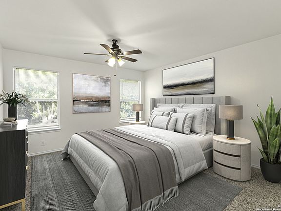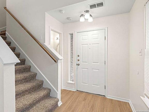 Welcome to this charming 3-bedroom, 2.5-bathroom home nestled in the gated community of Crossings at Quail Creek. Step inside to a bright and open living area featuring soaring ceilings, a cozy fireplace, and walls of windows that fill the space with natural light. The eat-in kitchen with breakfast nook is perfect for casual dining and entertaining. Upstairs, you'll find spacious bedrooms, including a comfortable primary suite. Enjoy a private backyard retreat with a covered patio-ideal for relaxing or hosting gatherings. Conveniently located near the Medical Center, Lackland AFB, USAA, plus shopping and dining along Bandera and Tezel Rd. Outdoor lovers will appreciate quick access to the Leon Creek Greenway Trail System.