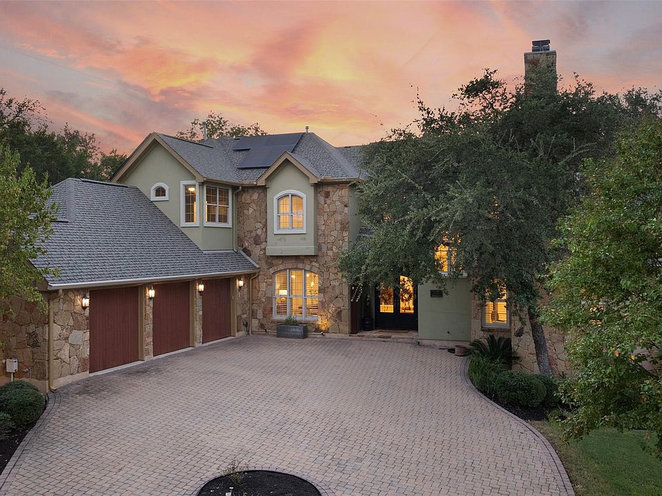 Set on just over three-quarters of an acre in the gated Greenshores community, this home offers both privacy and access to a residents-only waterfront park on Lake Austin. The property is surrounded by mature oaks and designed to balance comfortable everyday living with great spaces for entertaining. Inside, the main living area opens easily to a screened outdoor space with room for dining, lounging, and year-round gatherings. The kitchen features a large island with bar seating and flows into a light-filled living room with vaulted, beamed ceilings and a fireplace. The main level also includes the primary suite with a sitting area, expansive walk-in closet, and spa-style bath, plus a home office with full bath that could serve as a fifth bedroom. Upstairs, a large flex room, three additional bedrooms, and two full baths provide plenty of space for family or guests. Out back, towering oaks create a shaded retreat anchored by a sparkling pool and spa. Whether hosting a crowd or enjoying a quiet evening, the setting feels like your own private escape. Recent upgrades include paid-off solar panels, EV charger, new upgraded flooring, whole-home sound system, and fresh interior paint throughout. This home brings together generous indoor and outdoor living, thoughtful updates, and a sought-after Lake Austin lifestyle in one of the city’s most desirable communities.