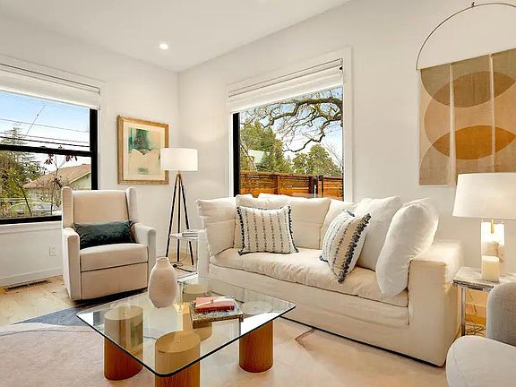 Serene & spacious with streams of natural lighting, vaulted ceilings; Living area features a plush Restoration Hardware sofa with matching ottoman