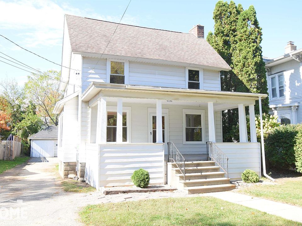 Northside Owosso - Huge covered front porch, perfect for a porch swing and welcomes you into the open living room with hardwood floors, orig. woodwork, fireplace, and open staircase! Large windows, new 2025! New white kitchen with appliances 2025! Archway to breakfast nook. Full basement is very useable and partially finished. Washer and dryer included! Renovated bathroom 2025! New furnace 2025! New electric panel 2025!
