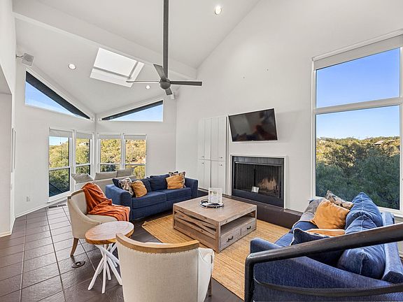 Sweeping views of Lake Travis and the Texas Hill Country define this truly unique, treehouse-style retreat. Set across three levels, this one-of-a-kind home offers a rare blend of architectural charm, natural light, and modern updates. Make your way into the main living area and be welcomed by an open floorplan featuring lofty ceilings, a cozy fireplace, and a wall of windows that flood the space with sunlight and showcase the stunning views. A spacious deck runs the full width of the home, offering the perfect setting to unwind or entertain. The sleek, euro-style kitchen boasts modern cabinetry, a large center island, and direct access to another balcony ideal for alfresco dining. Two bedrooms share the main living level, while the private top-floor primary suite is a true retreat with its own fireplace, a seating nook, private balcony, and a spa-like bath featuring dual vanities, glass brick walk-in shower, and ample built-in storage. The ground level includes a large utility room and two flexible bonus rooms—perfect for guest suites or home office. Wander outside to your backyard oasis with a sparkling in-ground pool, hot tub, and multiple outdoor entertaining options. Watch small planes land in the distance, observe local wildlife, and enjoy everything that lakefront living can offer. Updated with care: new French drain (2025), pool filter and grinder pump (2024), subpanel brought to code (2024), pool automation system and hot tub heater (2023), dual AC units, gutters, foundation repair w/ 10-year warranty, new plastered pool surface, pool gate, and several windows/sliding doors (2022). Quiet neighborhood, 2-car garage, carport, extended driveway. A rare gem with unmatched character, views, and potential. A perfect private retreat or lucrative short-term rental property - STRs are permitted in this location! ***Mortgage savings may be available for buyers of this listing. Inquire with listing agent for details.***