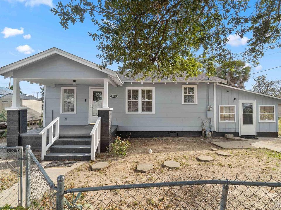 This 1,560 square foot, 3 bedroom, 3 bath, East Hill Beauty has been renovated and is ready for move in! Adorned with fresh pretty paint on the exterior, this home bodes you to come inside for a closer look! Stepping through the gate onto the covered front porch, you know you've found the place to sit and enjoy the beauty of a sunny Florida day. Inside, you're greeted with a large open family room and spacious dining area. The adjoining kitchen offers new countertops, lovely tile backsplash, and new appliances including a gas range/oven, refrigerator, and range hood. A large step down bonus room offers a full bath, perfect for hosting a gathering that includes hosting guests in this room with access to the kitchen and maintaining privacy in the rest of your home or add a pool to the spacious backyard and have this full bath act as the pool bath. On the other side of the home, off the family room are the three spacious bedrooms and two baths. The primary bath offers an ensuite bath with new flooring, vanity, granite countertop, mirror, fixtures, deep soaking tub, and comfort height toilet. The hall bath shares these upgrades. This hall also includes a large utility/storage room and deep hall closet with shelves. Throughout the house is luxury vinyl plank flooring, wide baseboards, and ceiling fans in all bedrooms, bonus room, and family room. Other recent upgrades include the architectural shingle roof, HVAC, water heater, plumbing, and electrical. The fully fenced lot and large backyard leave room to enjoy or grow and expand. The only thing this house is missing is you. Make plans to see it today! Seller will assist with closing costs.