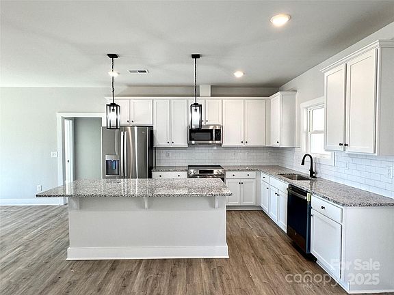 Welcome home to this charming new construction 3 bedroom 2 bath ranch with beautiful oversized covered back porch. This home has welcoming, bright kitchen with white soft close cabinets and drawers, granite countertops, white subway tile backsplash and gorgeous large island with plenty of seating available. Large walk in pantry. Enjoy your covered porch/back yard view from picturesque window above kitchen sink. This home has ample closet space and full length of the home attic space storage with plywood already installed for all of your storage needs. Home is wheelchair friendly with 3’ wide doors to primary bed/bath and laundry room. No stairs and minimal rise into home entry and patio doors.