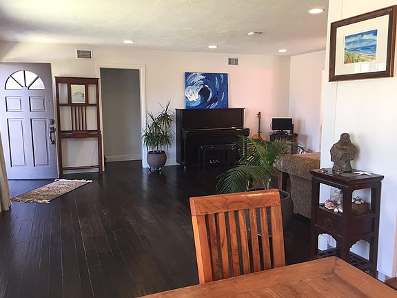 Less than 1 mile from the beach, bright and open... Filled with ocean breezes and great sunsets. Peak Ocean views. 3 large bedrooms and 2 full bath single family home on a quarter acre corner lot. Hardwood floors throughout with tumbled stone flooring in Master Bedroom. Master boasts over sized french doors leading out to a private stone deck. Kitchen has new stainless steel appliances and oven with tiled counters. Open floor plan includes family room and bonus room with saltillo tile and wood burning fireplace. Huge yard with well manicured tropical landscaping. Landscape services included. Central Air and heat (Nest thermostat). Washer/Dryer hook up available in 2 Car Garage. Located on cul de sac in a quiet neighborhood with top rated Encinitas schools. Now accepting rental applications. Home available between 10/1/24-10/15/24. Prequalification required. Please contact for a showing. 12 Month Lease required. One Year Lease No smoking on property All adult occupants must be on lease and qualify with a background, credit, and income verification Dog allowed, no cats.