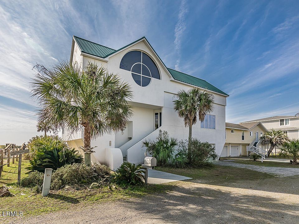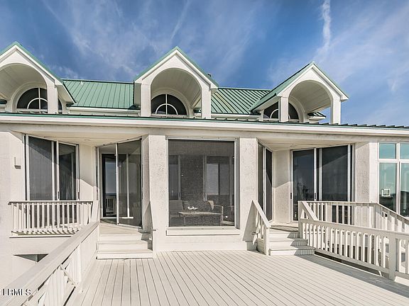 OCEANFRONT - ONE OF A KIND! Sold ''AS IS'' - Looking for a unique solidly built home? This 4-bedroom/4-bath Ed Cheshire designed home has quality throughout with curved walls, arched doorways, unique windows design, private balconies and oversized deck ... all overlooking the Atlantic. 2023- Interior and exterior painted, new enlarged rear deck, hardwood floors on second floor refinished, new stainless kitchen appliances, two bathrooms updated, elevator for easy access and expansive workshop on ground level. This home boasts a SECOND FLOOR FAMILY REC ROOM plus Carolina room off one of the two main floor master bedrooms. The kitchen has loads of cabinets and adjacent oversized laundry room. Beach access runs along this property. Rental projection provided in Docs