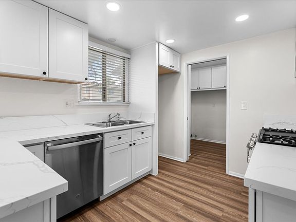 Plank flooringGreat natural lightQuartz countersDining areaStainless steel appliancesNew cabinetsFull laundry room