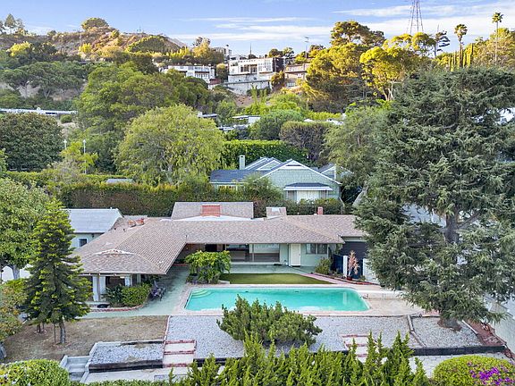 Tucked away at the top of a quiet cul-de-sac in the storied Outpost Estates, this gated mid-century retreat is the kind of Hollywood hideaway that rarely comes to market. Set on an extra-large, rare flat lot in the hills an absolute unicorn for this iconic neighborhood -- the property channels classic Frank Sinatra-era glamour and timeless California cool. Beyond the gates, a sprawling single-story home unfolds with wood-beam ceilings, walls of glass, and indoor-outdoor flow designed for the ultimate Hollywood lifestyle. The sun-soaked living room, anchored by a dramatic mid-century fireplace, looks straight out to the shimmering pool, while the main bedroom's walls of windows frame that same cinematic backdrop -- the perfect invitation for late-night swims and private skinny dips under the stars. With 4 bedrooms and 4 bathrooms, including two bedrooms with soaring vaulted ceilings and exposed beams, the home's architecture whispers with potential. Outside, mature greenery and hillside privacy surround a sparkling pool and flat usable yard, with greenbelt and city views setting the scene for sunset cocktails, dinner parties, and endless LA nights. Whether you envision restoring its 1951 mid-century soul or designing a modern masterpiece from the ground up, this is a once-in-a-generation opportunity to reimagine a classic. A true fixer with pedigree, space, and soul -- where the past meets possibility and where Hollywood dreams still come to life.