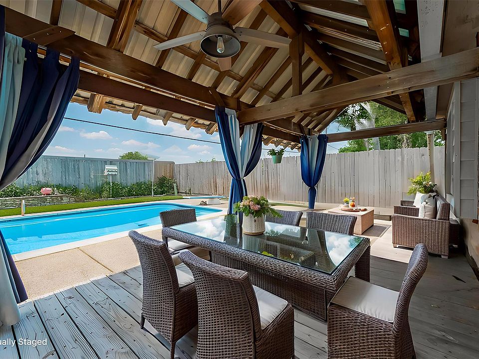 Welcome to 7230 Redding Road in Houston’s Sharpstown neighborhood. This home stands out with its amazing 42-foot diving pool and real diving board—perfect for workouts, swim practice, or just hanging out with family and friends. You’ll love the location too, with shopping, restaurants, and schools all close by. St. Francis de Sales, Strake Jesuit, and St. Agnes Academy are just minutes away, along with nearby churches and community spots. This home isn’t just a place to live, it’s a spot where comfort, convenience, and fun all come together. A true mid-century statement piece, this home features a freestanding cone fireplace that adds warmth and character to the living space. Its bold design and retro charm make it perfect for cozy evenings or simply as a conversation starter. Paired with vaulted ceilings and plenty of natural light, this fireplace gives the room a stylish touch that sets the home apart. Updated kitchen, separate formal dining and flex room/4th bedroom.