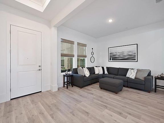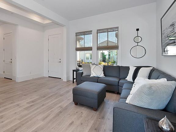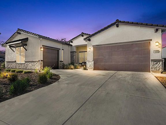 STUNNING ONE STORY HOME BUILT IN 2024 HAS 3 BEDROOMS, 3.5 BATHS AND VIEWS OF COMMON AREA AND OAK TREES Grand entertainer's home has open and light floor plan, cathedral and trey ceilings, crown molding, walls of glass plus covered veranda and overlooks greenbelt. Exceptional upgraded 2,740 sf home has 3 bedrooms with game/family room plus office area which can be converted to fourth bedroom. Exquisite interiors with extensive Luxury Vinyl Plank Flooring, Quartz slab counters with waterfall feature plus energy efficient LED lighting. Dramatic great room with double trey ceiling and slider doors leading to covered veranda with iron fenced yard. Large center island kitchen has slab Quartz counters, subway tile backsplash, oversized entertaining bar, pendant lighting, custom cabinetry with soft close drawers, walk-in pantry and high-end stainless steel appliances. Stunning dining area has wrap around floor-to-ceiling windows with vista views. Primary suite has cathedral ceiling, wall to wall windows, 2 walk-in closets, luxurious bath with separate double vanities, floating tub and subway tile shower with seat. Two junior suites have walk-in closets and easy access to game/family room. Three car Garage. Owned Solar system with low utility bills.