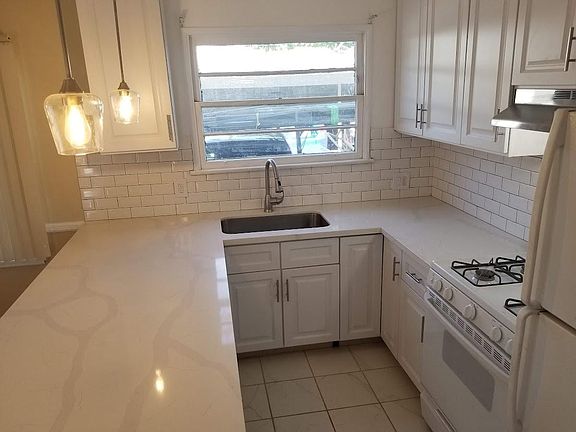 Kitchen is completely new with quartz countertops, new subway backsplash tiles, stainless steel sink, lots of kitchen cabinets, stove, refrigerator.
