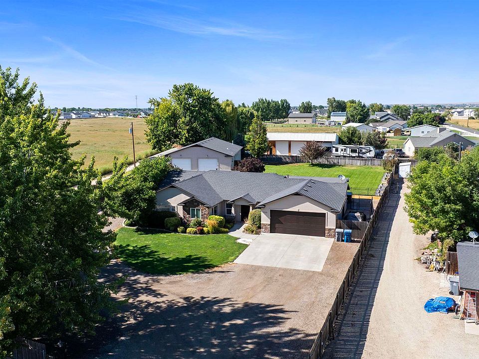 Rare acreage property just minutes from the freeway, shopping, and medical facilities featuring a fully updated 3 bed/2 bath single-level home with renovated bathrooms, new paint, lighting, blinds, serviced HVAC, newer water heater and washer, spacious master suite, hardwood/tile floors, outdoor kitchen with covered patio, newer hot tub, propane firepit, lush irrigated landscaping, two large shops (one climate-controlled, 3,600 sq. ft. with separate power, one 1,500 sq. ft.), RV dump, new driveway/landscape lighting, rod iron pet fencing, roof/gutters (2019), and no HOA—offering the perfect blend of convenience, upgrades, and space for toys, pets, and hobbies.