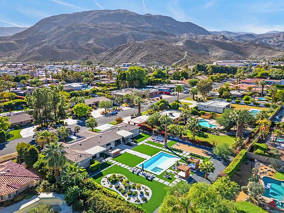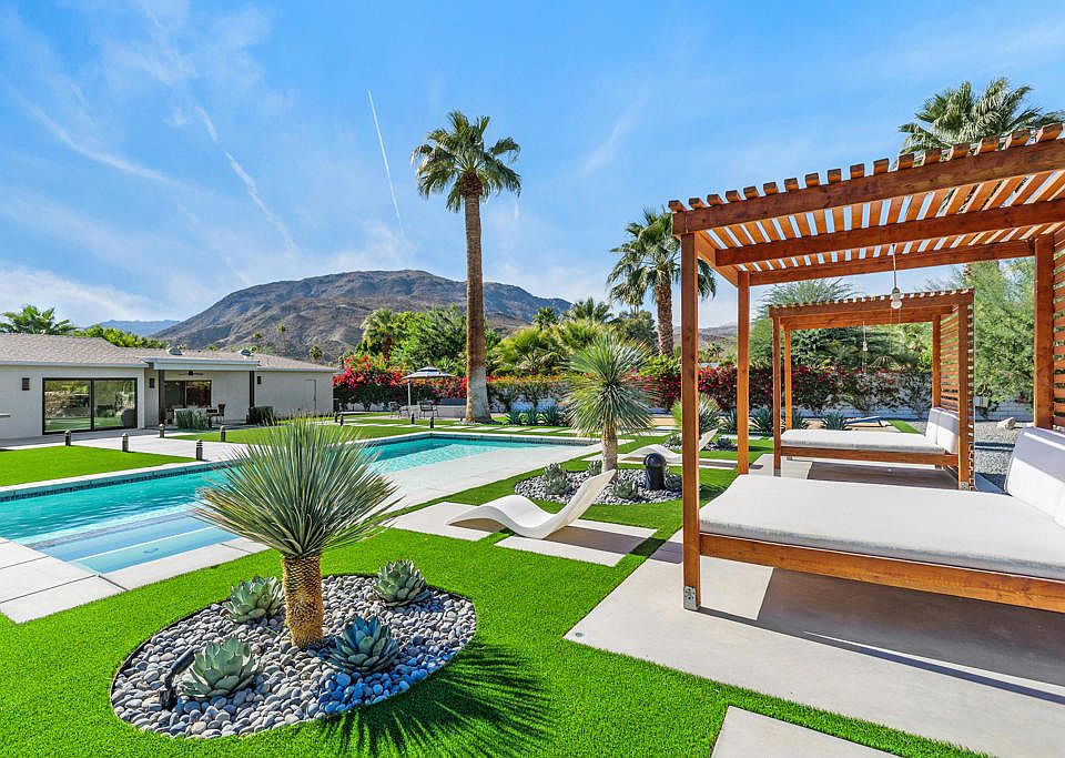Welcome to a beautiful modern retreat in Rancho Mirage, where luxury and timeless design meet. This 4-bedroom, 3-bathroom home, set on a private .42-acre lot, captures the essence of resort-like living with sweeping mountain views and sophisticated indoor-outdoor spaces. The light-filled Great Room greets you with floor-to-ceiling windows, vaulted wood plank ceilings, and contemporary light fixtures. Concrete-look porcelain tile flooring and a sleek electric fireplace add a touch of refined elegance. The gourmet kitchen features Viking appliances, a wine fridge, waterfall quartz countertops, and a spacious breakfast bar. The primary suite is a true sanctuary with custom finishes, a walk-in shower, dual sinks, and a well-organized closet. An additional suite with a private entrance and kitchenette offers a versatile casita option. A leased solar system ensures energy efficiency. Outside, this home is an entertainer's dream. Privacy walls surround the backyard's custom pool, spa, tanning shelf, two luxury cabanas, a fire pit, a bocce ball court, and BBQ. Landscape lighting enhances the space, creating a stunning desert oasis. Situated in the heart of Rancho Mirage, this property is minutes from Palm Springs, Palm Desert, and the famed El Paseo shopping district, with easy access to golf courses, hiking, and top dining. This home offers a blend of privacy, elegance, and modern desert living in one of the Coachella Valley's most desirable locations.