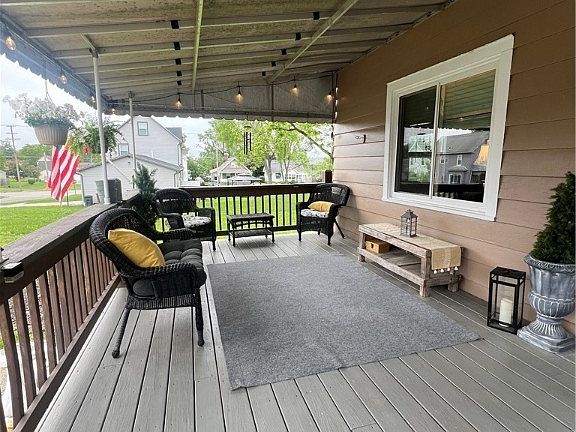 Welcome to your quaint new home in Struthers, where the charm greets you at the massive covered front porch. You will be in love as you catch a glimpse of the open living floor plan, featuring dark walnut floors that flow into the dining area. Continue into the hallway where 2 bedrooms with appointed closets and a bathroom lay ready. Step into the kitchen with awesome wall storage, built-in stowaway workspace, and appliances to remain, with the 3rd bedroom/office off of the kitchen. Head to the basement where you’ll find the family room with carpeted living space, equipped with washer and dryer in the laundry space with a walk in closet and plentiful amount of storage on the other side. Once you move outdoors, the L-shaped lot provides you with an oasis, fit with a partial privacy fence (2023), a gazebo (2023), new deck (2023) and a shed! This home as a new roof and gutters (2024) large front sliding window (2024 ) a new chimney (2024) new window screens and hardware (2024) restored and upkept flooring (2021) new light fixtures and ceiling fans (2023) faux wood blinds (2023) water heater (2017) as well as yearly routine maintenance on hvac and AC hooked up to a new thermostat (2024). Do not wait and miss your chance to call this home!