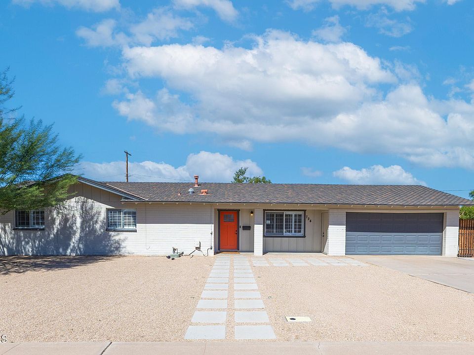 Charming mid-century modern ranch nestled in the heart of Mesa—just minutes from downtown, the Light Rail, and the vibrant arts and dining of Main Street—yet quietly tucked away on a peaceful residential street. Tastefully remodeled throughout, the home showcases wood-look tile flooring, upgraded fans and lighting, and refreshed baths and kitchen that blend timeless character with modern comfort. The spacious kitchen is beautifully updated, featuring an island with butcher block counter, quartz perimeter countertops, a neutral tile backsplash, farm-style apron sink, updated cabinetry, and stainless steel appliances—creating the perfect space for cooking, entertaining, and gathering. Outdoors, the generous private yard offers RV or additional parking, a grassy play area, and a covered patio ideal for entertaining or relaxing year-round.
