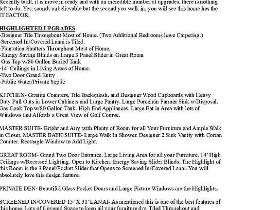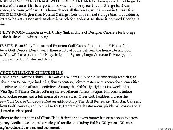 WELCOME HOME to this AMAZING, 2018 BUILT, BEAUTIFULLY DECORATED, CITRUS HILLS HOME ON THE MEADOWS GOLF COURSE WITH A COVETED SOCIAL MEMBERSHIP. You will love everything about this Great Room/Den, 3 Bedroom, 2 Bath, 2 Car Plus Golf Cart Garage Home on a Beautifully Landscaped Golf Course Home Site and the best news is that is minutes away from some the best amenities in the state of Florida. Recently built, it is move in ready and with an incredible number of upgrades, there is nothing left to do. The highlights of this well-built home include a well-designed, Kitchen w/plenty of counter (granite) and cupboard space (designer wood), High End Appliances including Gas Stove, and Eat In Area. Your Master Suite is private, has plenty of room for all your furniture, ample closet space, and a Bath Suite fit for royalty. It gets better, your Living Space includes a Great Room Design w/Private Den that opens to Oversized Screened In/Covered Lanai. Perfect for entertaining or everyday living. Talking about entertaining, your Large Screened In/Covered Lanai will steal the show. Measuring 15 X 31, it has plenty of room, overlooks the 11th hole of the Meadows Golf Course and it will be your happy spot. There is more! Two Additional Bedrooms are perfect for family, guests, ample in size, plenty of closet space, and split from Master Suite. Full Bath serves this area. Oversized 2 Car Plus Golf Cart Garage which is rare in Citrus Hills, Indoor Laundry Room and a Beautifully Landscaped Golf Course Home Site that offers a Peaceful, Easy Feeling that will put a smile on your face. Yes, sounds unbelievable but the second you walk in, you will see this home has the IT FACTOR.