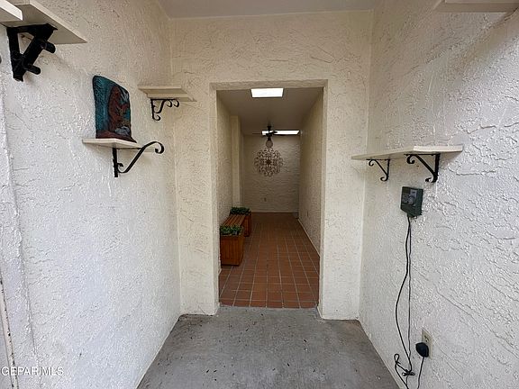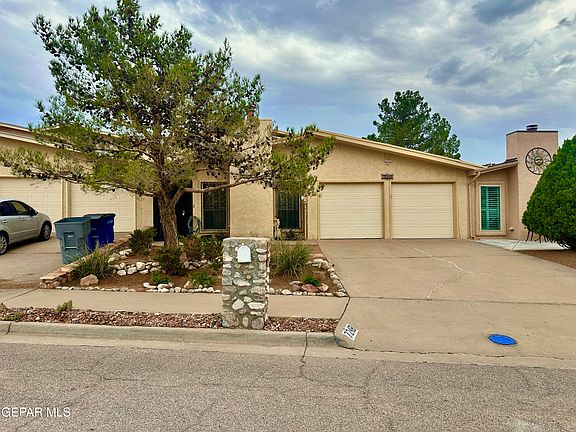 Inside, you'll find an inviting open family room with a cozy fireplace, plantation shutters, hardwood flooring, and refrigerated air for year-round comfort. The formal dining area flows into a bright kitchen with a breakfast nook, perfect for morning coffee. The primary suite is conveniently located on the main level, complete with French doors leading to a private enclosed patio, a walk-in closet, and a spacious ensuite with dual vanities and a shower/tub combo. A second bedroom and full bathroom are also located downstairs while upstairs you'll find two additional bedrooms and another full bath making it ideal for family or guests. Step outside to a backyard oasis featuring an enclosed sunroom, fruit trees, vegetable garden beds with breathtaking views of the Franklin Mountains. Don't miss this exceptional lease opportunity!