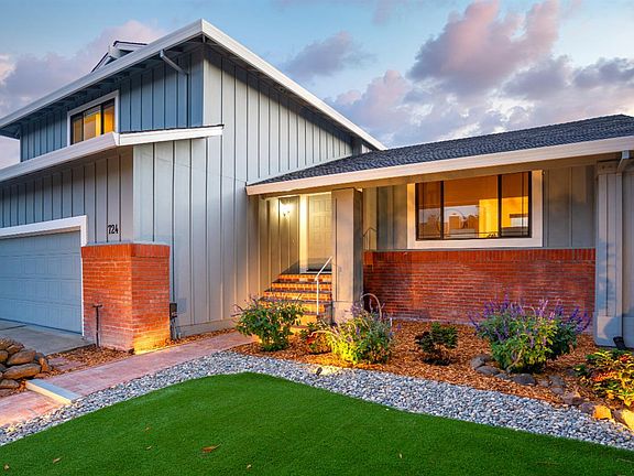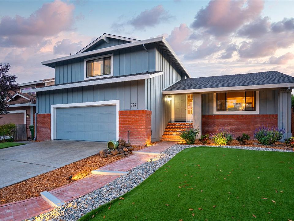 This Petaluma jewel stands out with wonderful living areas and a gorgeous yard. Venture past the meticulous artificial lawn, rock and bark landscaping, and brick walkway up to the front door. Just inside is the large living room with arching ceiling, oversized window, and dining space with chandelier. The kitchen offers abundant counterspace, backyard-facing window, and banister overlooking the family room den. Here you'll enjoy the large fireplace insert, backyard slider, and wet bar. A bedroom, full bathroom, laundry closet, and 2-car garage with finished flooring complete the lower levels. Upstairs holds two guest rooms with spacious closets and ceiling fans, a full bath, and the large primary suite with ceiling fan, multiple closets, two sinks, tub, and tiled shower. The open backyard touts a gorgeous patio, artificial lawn, garden shed, bark perimeter, and hot tub. Couple this with the newer furnace and hot water heater, along with the great location near wonderful shopping, dining, parks, and schools, and you'll love calling this home!