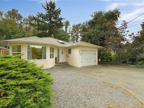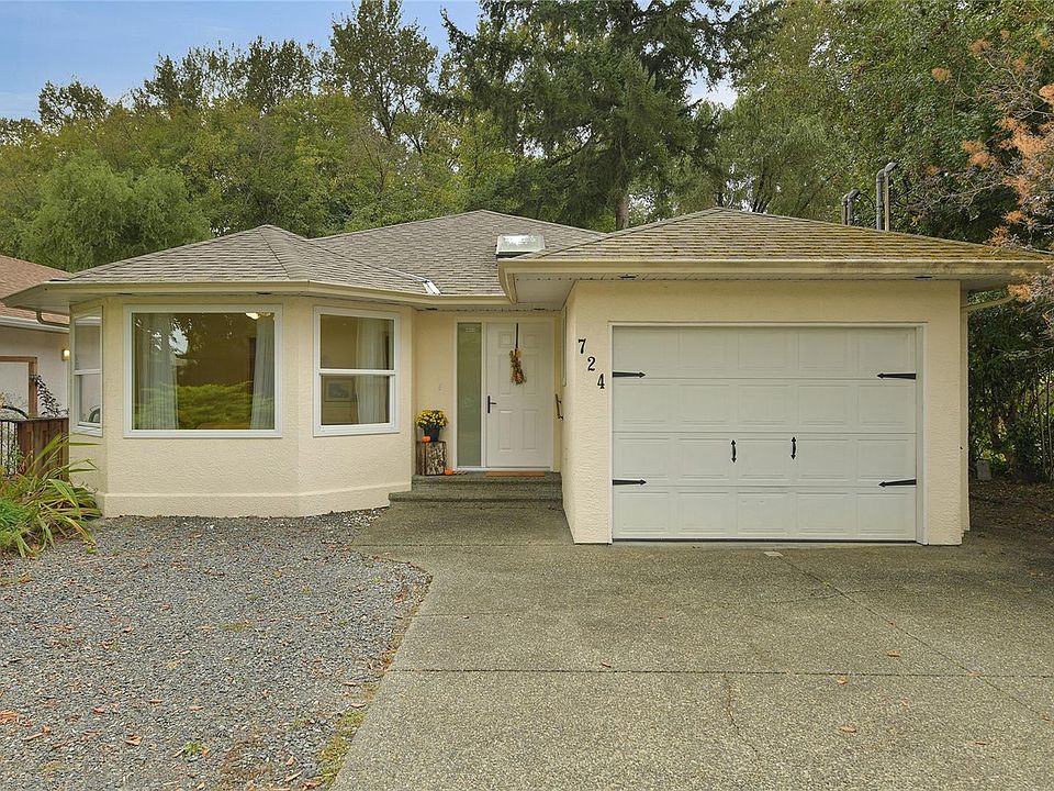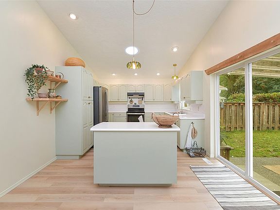 PRICED WELL UNDER ASSESSMENT. Welcome to this fantastic, move-in-ready rancher on a quiet cul-de-sac, central to all amenities. This home has been completely refreshed with new flooring throughout, new bathroom and kitchen fixtures, new lighting, and paint. Upgrades include a newer roof, vinyl windows, and a ductless electric heat pump for heating and cooling. The spacious primary bedroom features beautiful bay windows, a full ensuite bathroom, and a walk-in closet. There is a second bedroom as well as a den/office or third bedroom with laundry and extra storage. Enjoy the modern, open-concept kitchen, dining, and living areas with vaulted ceilings, loads of natural light, and a cozy propane fireplace. The private, sunny, peaceful, and easy-care backyard with a covered patio backs onto a forested area and parkland with tennis courts and walking trails. There are only 5 homes in this quiet 55+ strata, with only a shared roadway. Quick possession for this truly special offering!
