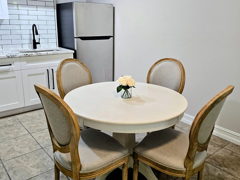 Beautiful one bedroom, one bath apartment. Part of a Duplex structure with large yard, fruit trees and lovely gardens. Newly renovated full kitchen and Bath with natural atone countertops, ample Living/Dining Area, and separate Bedroom with walk-in closet. Located in safe and quiet cul-de-sac street in Naples. Utilities are included (Electricity, Water and Internet). Wonderful neighbors and on-site, shared laundry facility. Unit is furnished, with 1st month and 1 month deposit requirement. Perfect for 1 or 2 persons (couple), one block away from bus terminal off Davis and Radio Road in Naples. Private parking is assigned at driveway!