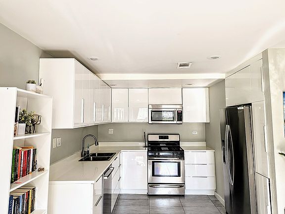 Modern sinkBack terraceWood floorsAdorable landscaped front patioQuartz countersCentral airLarge rain shower